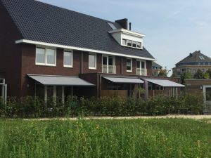 Terrasschermmen grijs gestreept Hennie’s Zonwering